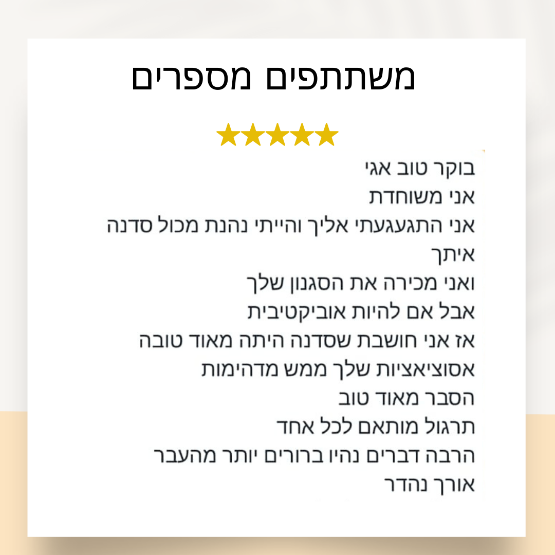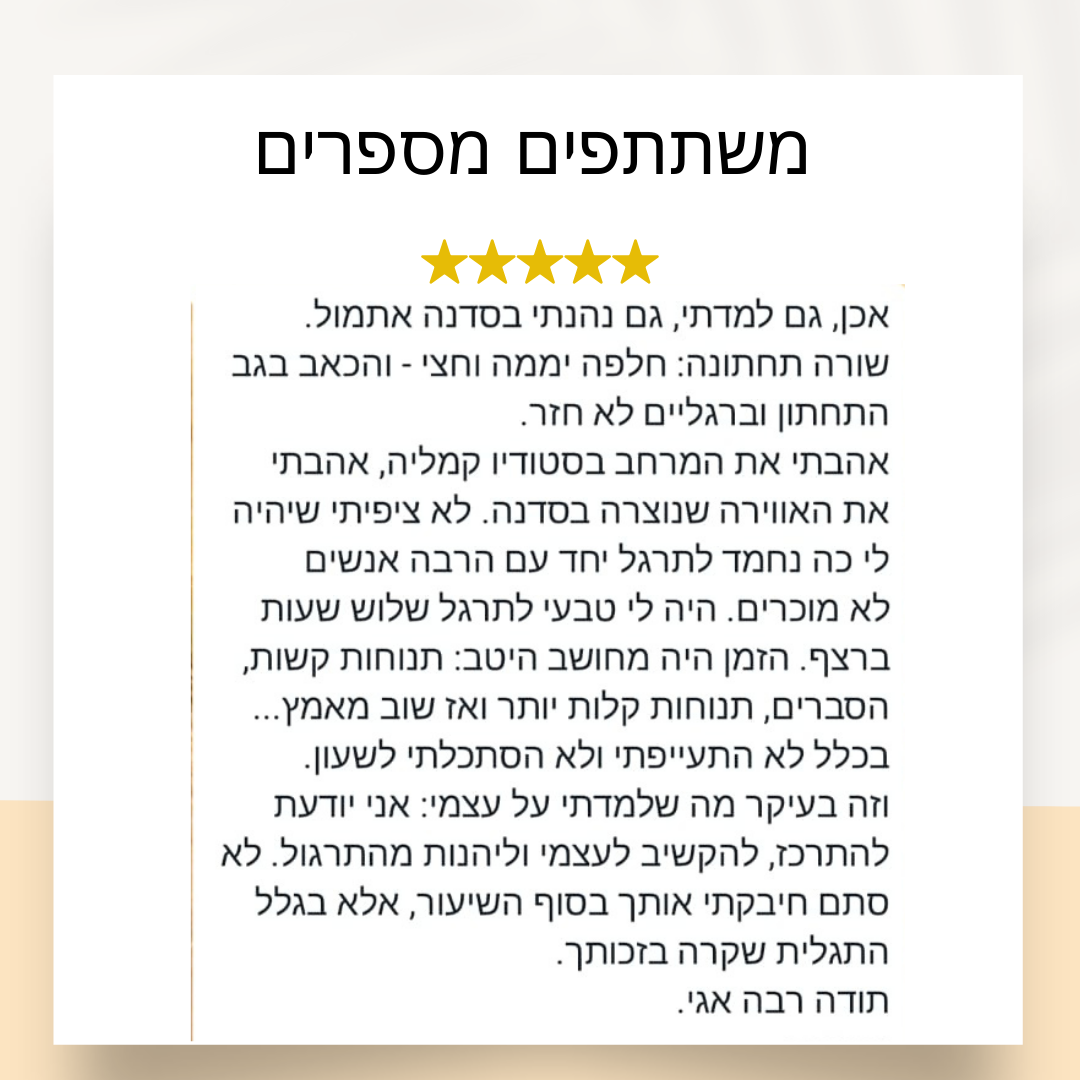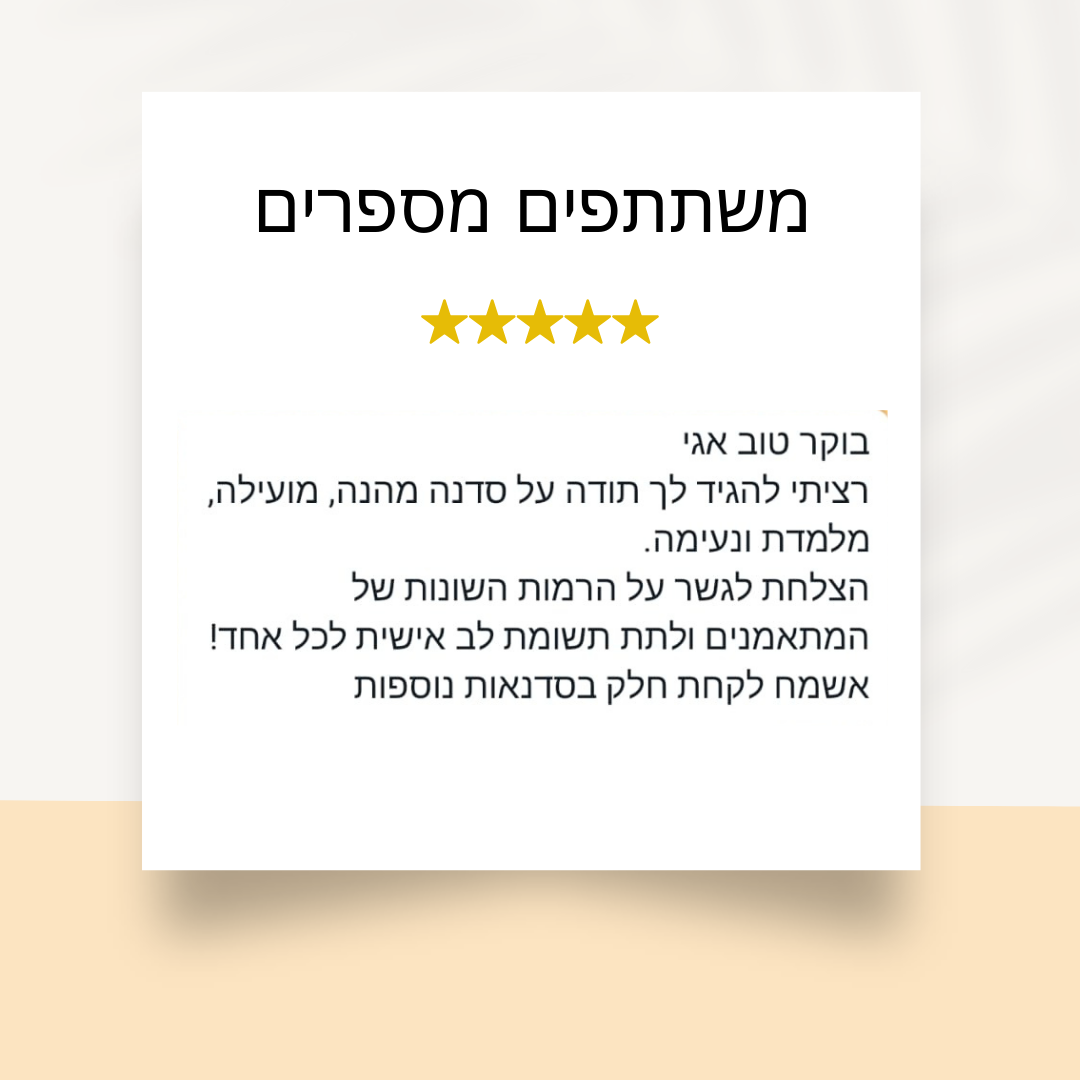 התרגול מותאם למשתתפים בהתחשב בניסיונם, מצבם הגופני והרגשי וצרכיהם האישיים – ומותנה במילוי הצהרת בריאות.